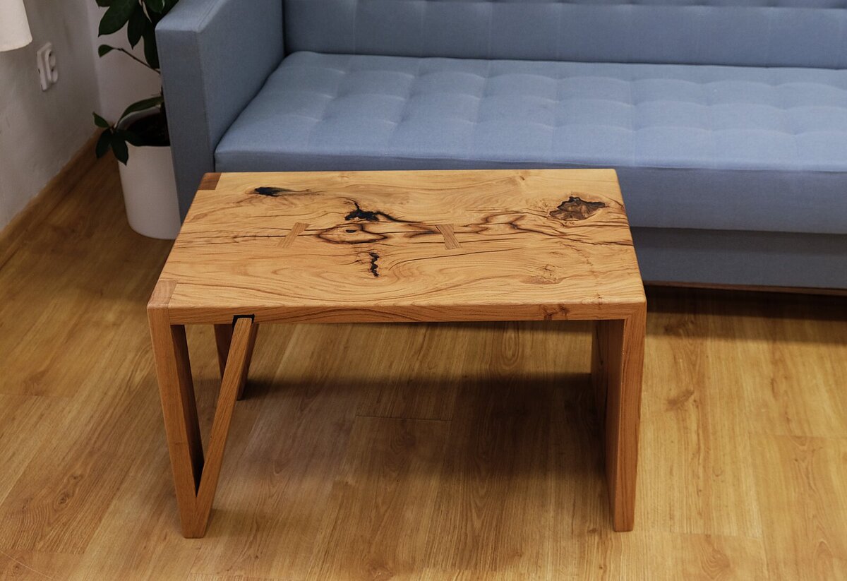 A co ve stolku vidí dneska s odstupem měsíce od dokončení? „Je to obyčejná věc, poctivě udělaná. Dopadlo to ve výsledku dobře, na to, kolik se toho mohlo podělat a podělalo. Bylo to před hranou absolutní zkázy, bylo to vždy na těsno, ale povedlo se.“ usmívá se tvůrce stolku. „Bylo to neztopené dřevo a vzniklo z toho „něco“, uzavírá Vojta naše povídání o stolku. „Vzhledem ke kazovosti to bylo odpadové dřevo, ale když se to přizná, může se to povýšit na něco, co funguje.“